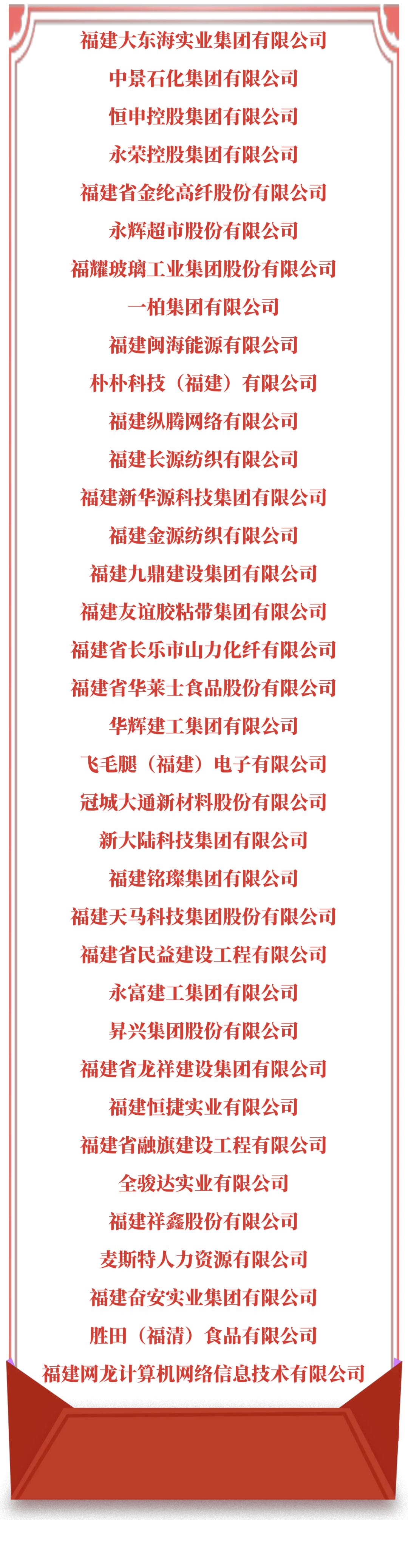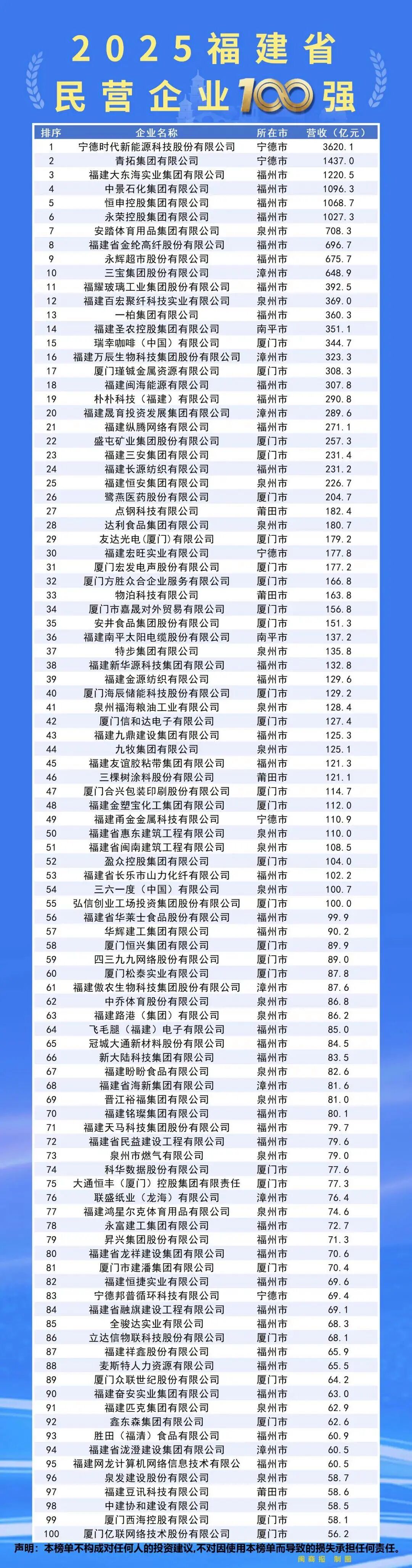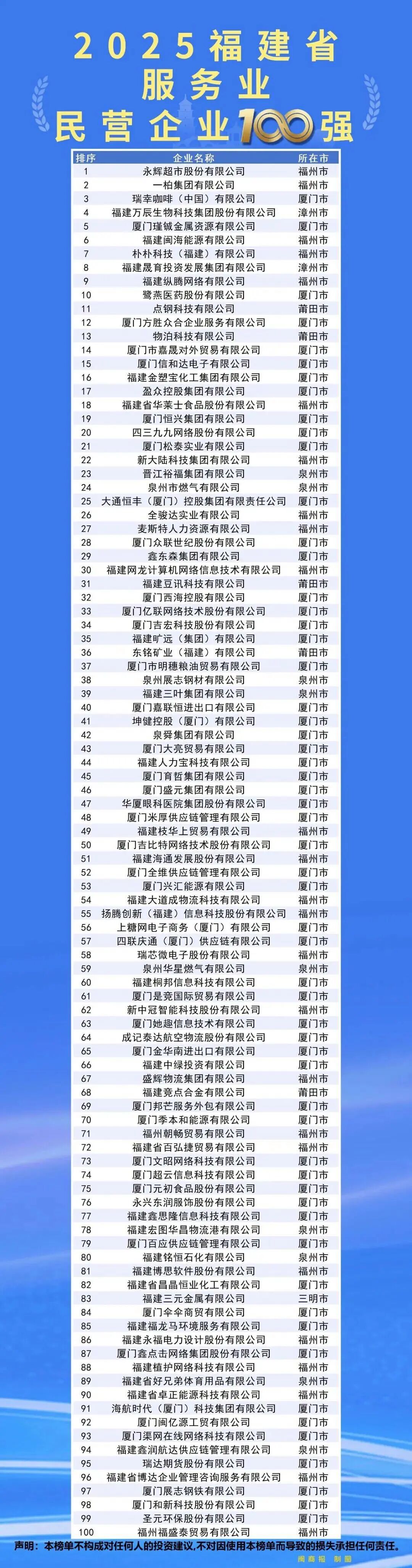 9月28日,福建省工商联发布2025福建民营企业100强、制造业100强、服务业100强、创新型100强等4个榜单。一年一度的福建省民企百强榜,是福建省民营经济繁荣的重要榜单,也是彰显各地市民营企业发展的舞台。