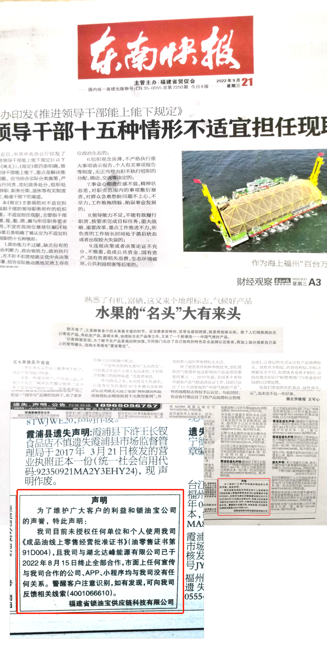 我司目前未授权任何单位和个人使用我司《成品油线上零售经营批准证书》(油零售证书第9ID004号),且我司与湖北达峰能源有限公司已于2022年8月15日终止全部合作,市面上任何宣传与我司合作的公司、APP、小程序均与我司没有任何关系。警醒客户注意识别,如有发现,可向我司反馈相关线索(4001066610)。
